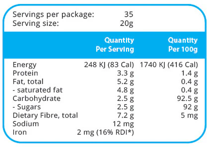 Banaban ORGANIC* Coconut Crunch is totally natural and comes from the air-dried coconut flesh after the extra virgin coconut oil has been removed. The dried coconut flesh retains a rich nutty coconut taste and crunchy texture. This product retains its natural colour and no bleaching or additives are used. Banaban ORGANIC* Coconut Crunch is an excellent source of dietary fibre and source of iron making it ideal as a healthy breakfast cereal and baking ingredient.
